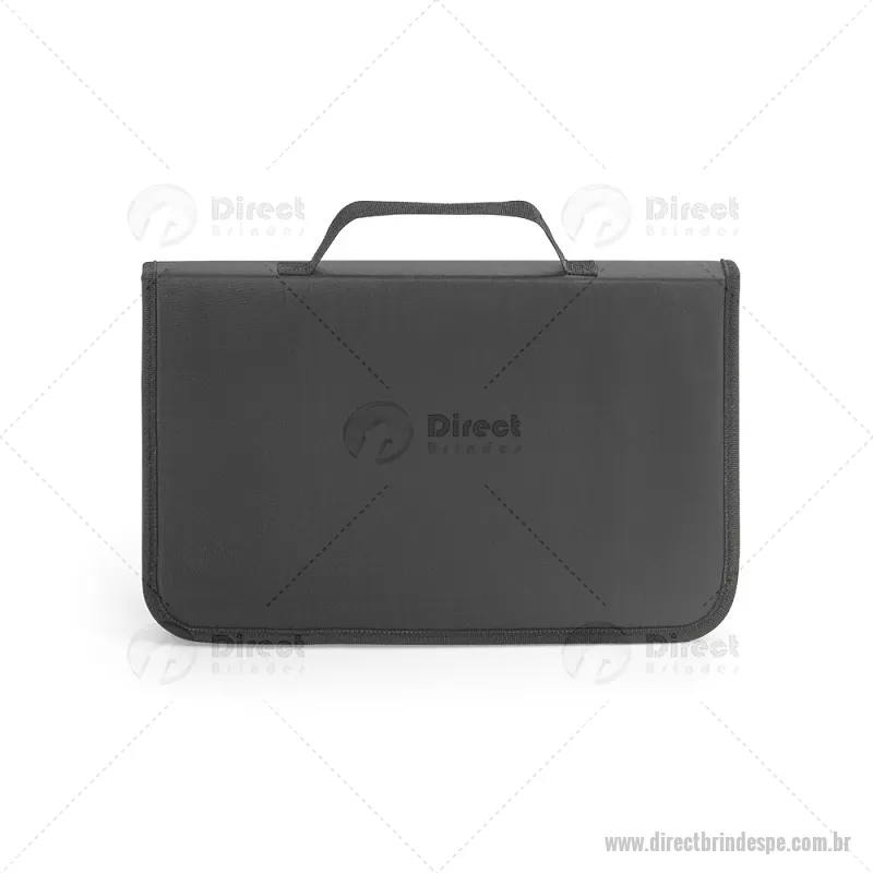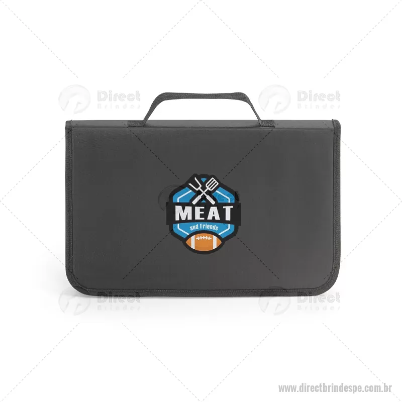 Kit churrasco em estojo de nylon 210D com tábua em PP e 5 utensílios em aço inox e PP: faca chefe, faca boning, faca pequena, garfo e afiador. Certificação EU Food Grade. Estojo: 350 x 230 x 40 mm | Tábua: 283 x 192 x 5 mm - - DRTPEKCH056
