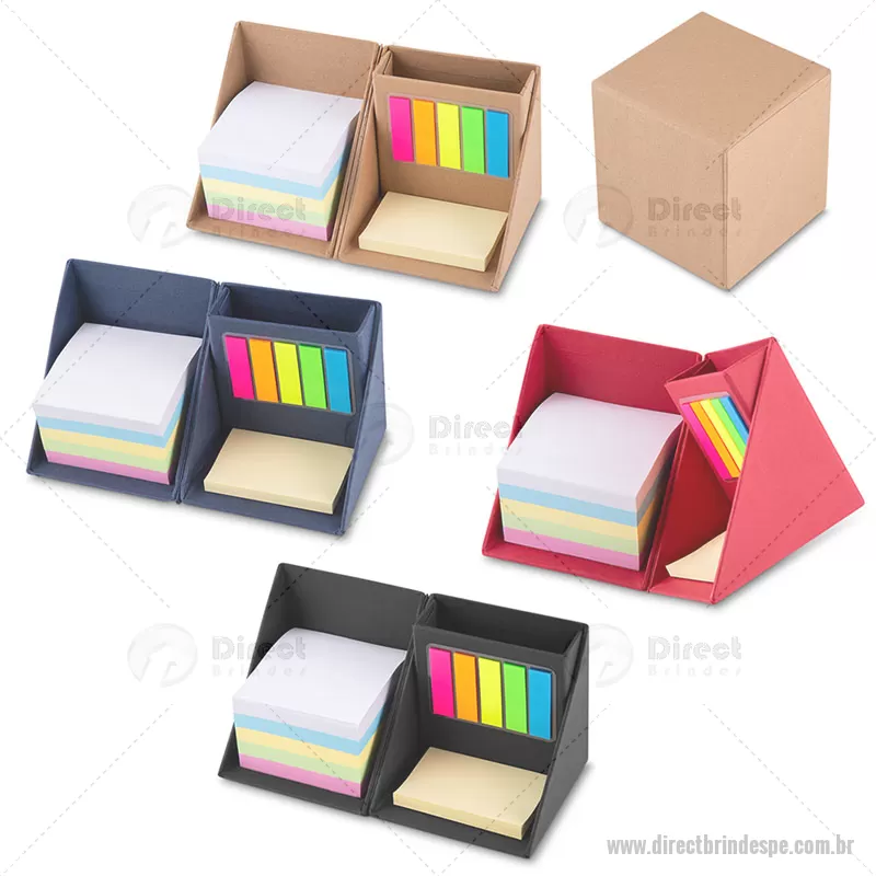 Bloco de anotações formato de cubo em papelão reciclado, contendo: 5 blocos autocolantes coloridos com 100 folhas de 7,5 x 7,5cm; 1 Bloco autocolante amarelo com 50 folhas; 5 Sticky notes coloridos com 20 folhas; Porta canetas. Dimensão do Produto: 9,5x9,5x9,5cm Peso do Produto: 0,306kg - - DRTPEBLC190