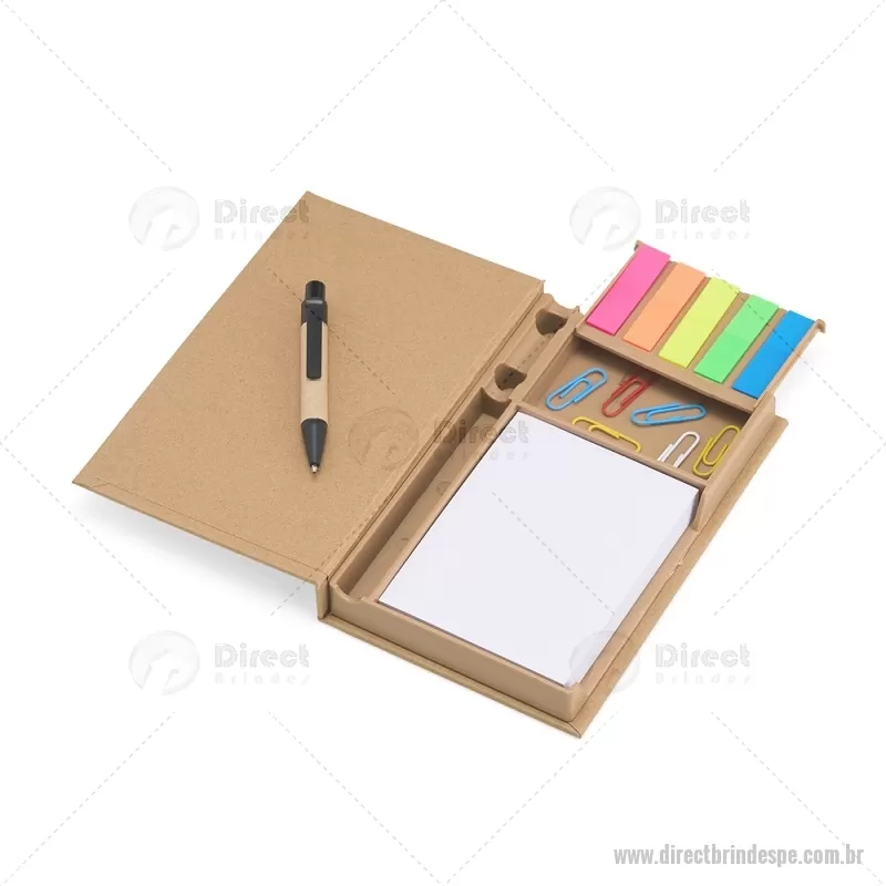 Bloco de Anotação com Autoadesivos e Caneta Tudo em seu lugar, prontinho para as anotações! Nosso Bloco de Anotações Ecológico é perfeito para manter a organização enquanto se registra ideias. Feito de material kraft, ele vem com 100 folhas brancas para anotações, 5 marcadores autoadesivos coloridos para destacar o que é importante, 7 clips guardados em uma gavetinha prática e uma mini caneta de papelão com carga esferográfica azul. E ainda conta com espaço para armazenar a caneta e dois suportes porta-caneta, garantindo praticidade no dia a dia. Este bloco é tudo o que o seu cliente precisa para dias repletos de anotações. Altura : 16,3 cm x Largura : 10,6 cm x Espessura : 2,1 cm Tamanho total aproximado (CxL): Caneta: 8,5 cm x 1,2 cm Peso aproximado (g): 191 - - DRTPEBLC243