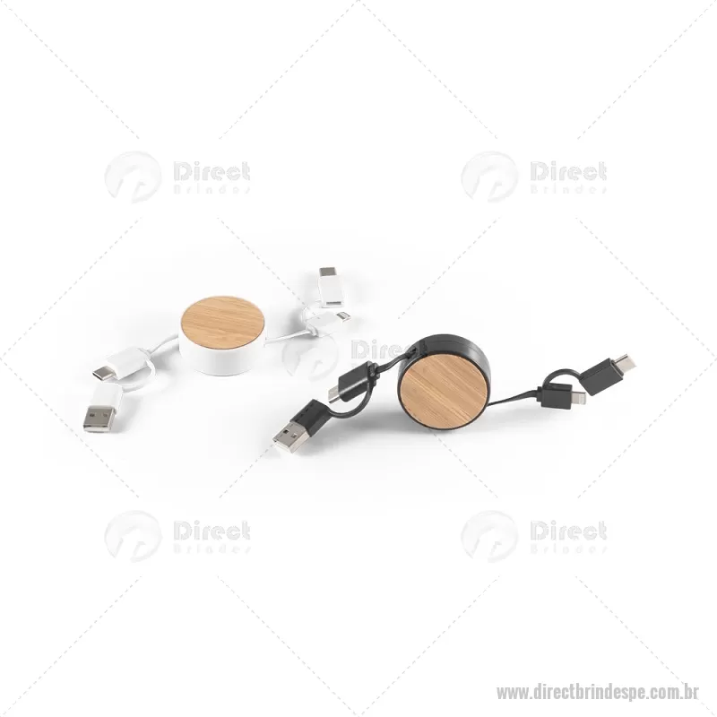 Cabo retrátil 6 em 1 em bambu e ABS. Uma das extremidades é USB-C com adaptador para USB-A, enquanto que na outra extremidade existe uma ponta especial 2 em 1 microUSB e lightning com adaptador para USB-C. Fornecido em caixa presente de papel kraft. A cor e o resultado da impressão nos materiais naturais pode variar entre produtos. Medidas cabo 40 x 130 mm | Cabo esticado: 40 x 850 mm Our Nature - - DRTPETEC523