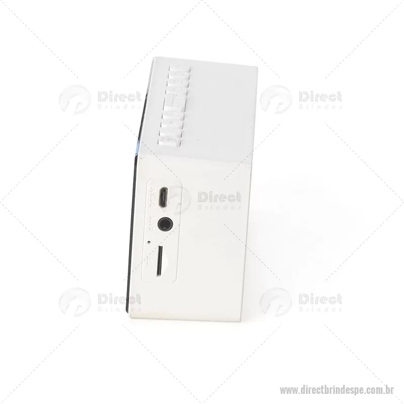 Caixa de som multimídia com relógio despertador e suporte para celular. Produzida em plástico e com borrachas antiderrapantes na área inferior, a caixa de som tem a área frontal com display de LED, além de um compartimento com suporte para celular – uma espécie de “gaveta” aonde é exibido (MUSIC), basta puxá-la ter acesso ao compartimento. A caixa de som executa nos modos bluetooth, cartão TF-microSD e entrada auxiliar P2. Acompanha cabo USB e manual em inglês. Medidas: Altura : 6,2 cm x Largura : 12,4 cm x espessura : 4,1 cm Peso aproximado (g): 230 Material : Plástico Duração da Bateria: ± 14 Horas Frequência: 100Hz – 18KHz Potência de entrada: 5V == 1000mA Bluetooth: V 5.0 - - DRTPETEC441