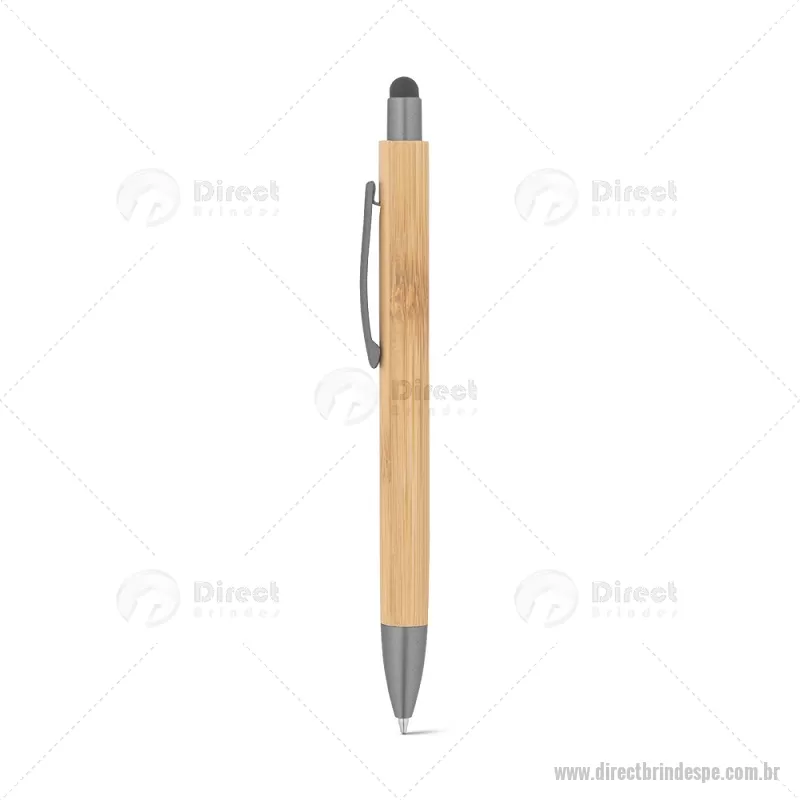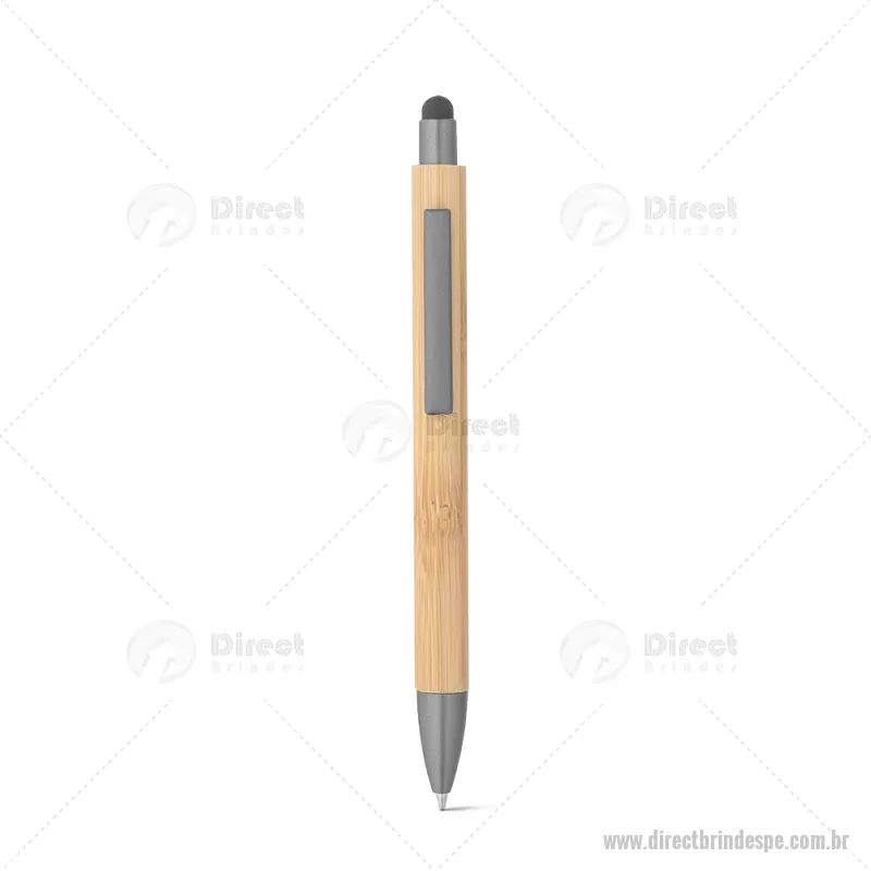 Esferográfica em bambu com clipe em metal e acabamento mate. Possui ponteira touch em cinza metálico para contato apropriado com telas. Esferográfica amiga do ambiente. Escrita em preto. - - DRTPECPECO065