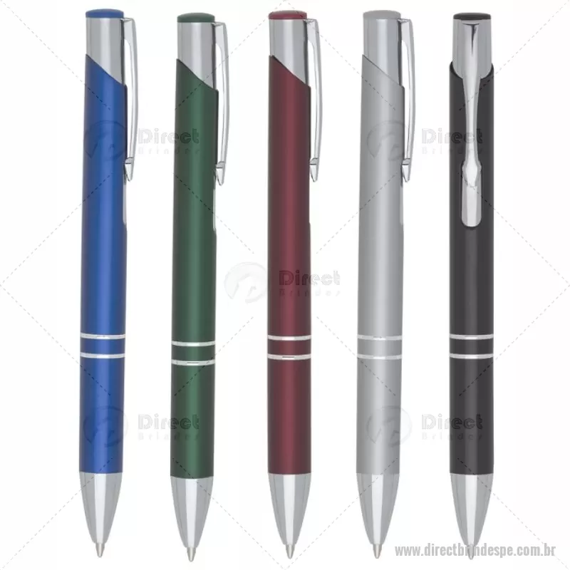 Caneta metal inteira colorida com detalhes prata. Clip metal com a ponta do acionador na cor da peça, parte inferior com dois anéis prata. Aciona por clique. - - DRTPECMT016