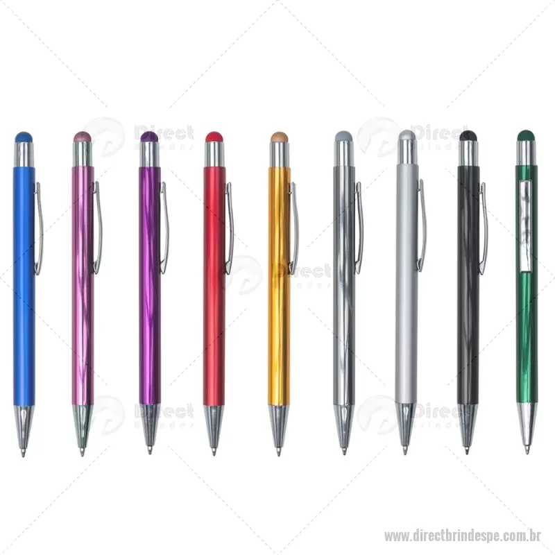 Caneta metal touch com detalhes prata. Clip metálico prata com “anel” superior e borracha touch colorida(mesma cor da caneta). Aciona por clique. - - DRTPECMT197