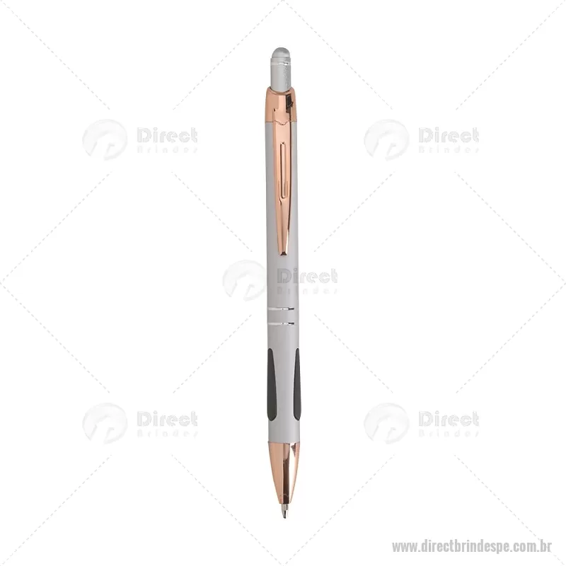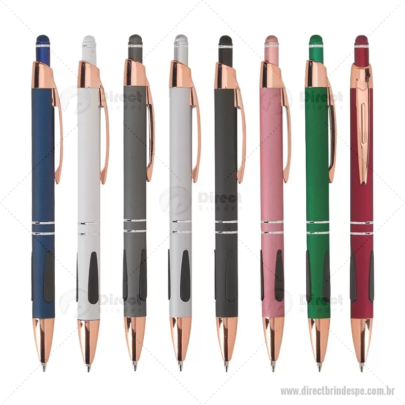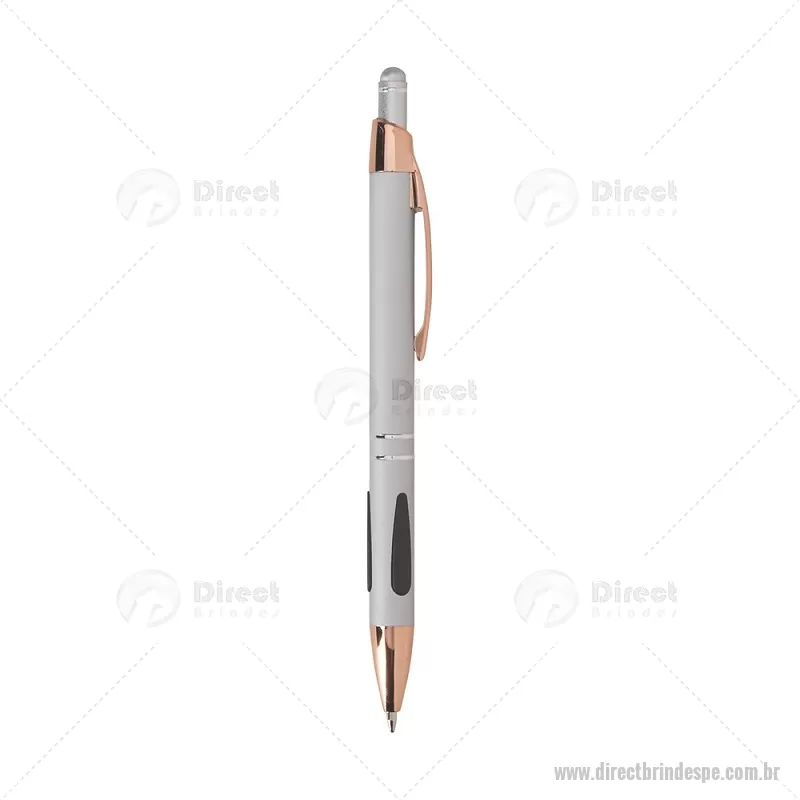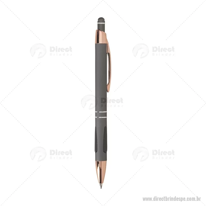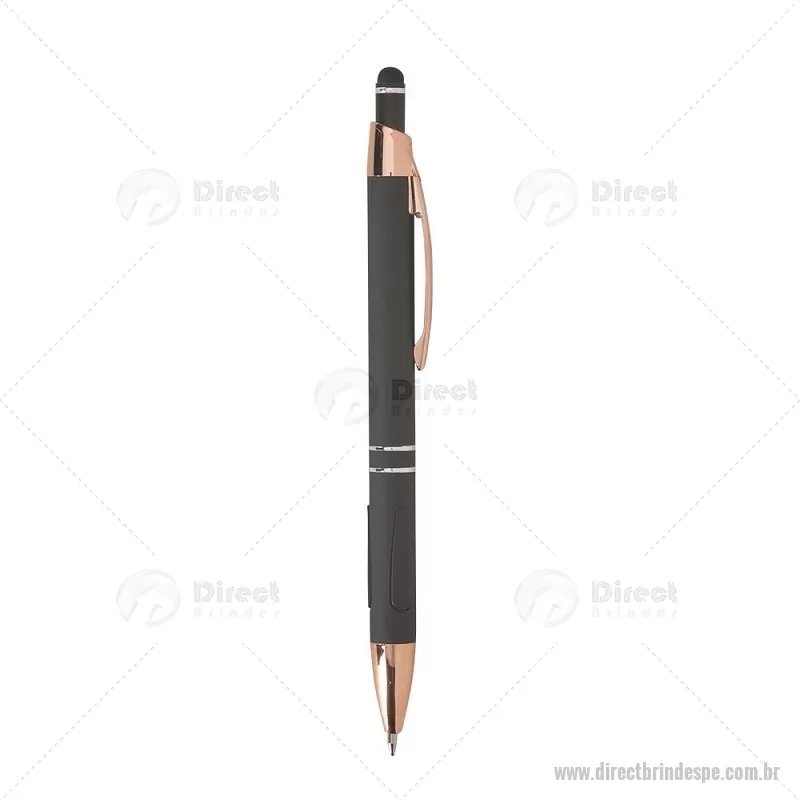 Caneta em metal com detalhes emborrachados, carga esferográfica azul 1,0 mm e acionamento por clique. Possui ponta touch emborrachada para uso em telas sensíveis ao toque, unindo escrita e praticidade em um só item. - - DRTPECMT295