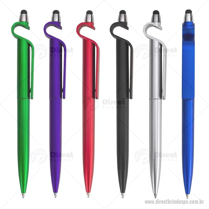Caneta plástica com suporte para celular e touch screen. Carga esferográfica azul e acionamento por rotação. - - DRTPECPL201