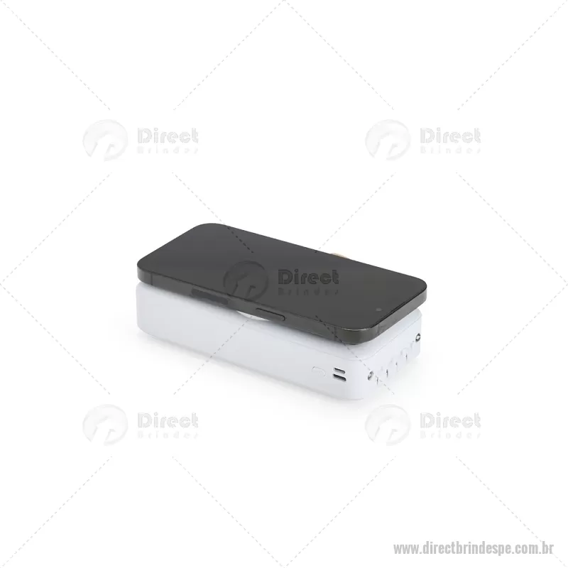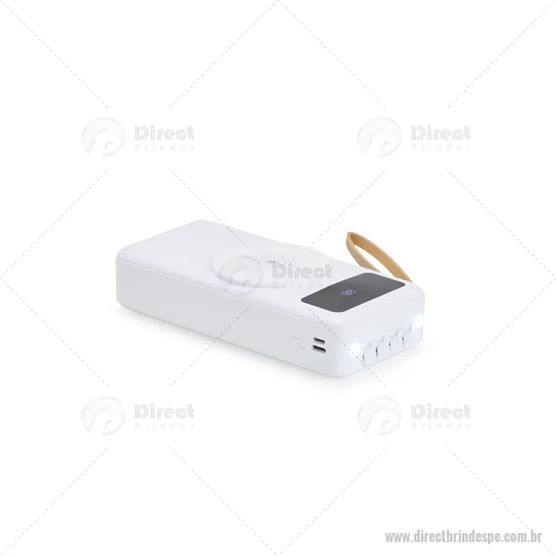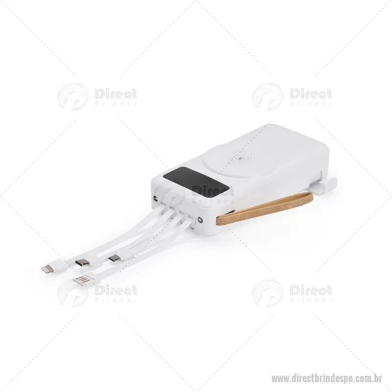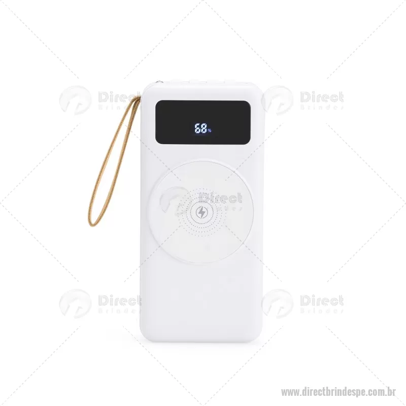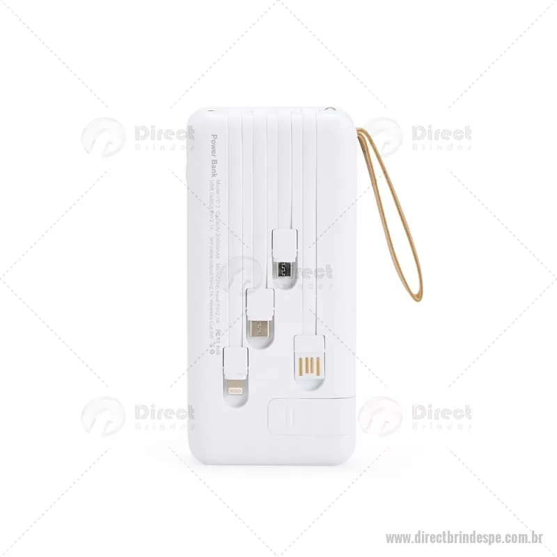 Carregador Power Bank USB 20.000mAh Descrição: Power bank em plástico com capacidade de 20.000mAh, painel de LED que indica o percentual de bateria, alça em couro sintético para transporte e suporte lateral que permite apoiar aparelhos na horizontal. Possui quatro cabos acoplados, incluindo: USB-C, Micro USB, Lightning e Cabo USB, além de espaço reservado para carregamento por indução de aparelhos compatíveis. Dispõe ainda de conexões USB-C, Micro-USB e USB para recarga do próprio dispositivo. Altura : 14,5 cm x Largura : 7 cm x Espessura : 3,5 cm Peso aproximado (g): 424 - - DRTPETEC530