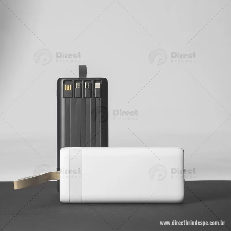 Power Bank 20.000mAh com Lanterna e Multissaídas Descrição: Power bank em plástico com capacidade de até 20.000mAh. Possui quatro cabos integrados com saídas Lightning, USB-C, Micro-USB e USB. Conta ainda com duas entradas, uma USB-A e outra USB-C, painel de LED numérico e lanterna frontal e alça fixa em couro sintético para transporte. Acompanha cabo USB-C. Altura : 15 cm x Largura : 6,8 cm x Espessura : 3 cm Peso aproximado (g): 418 - - DRTPETEC532