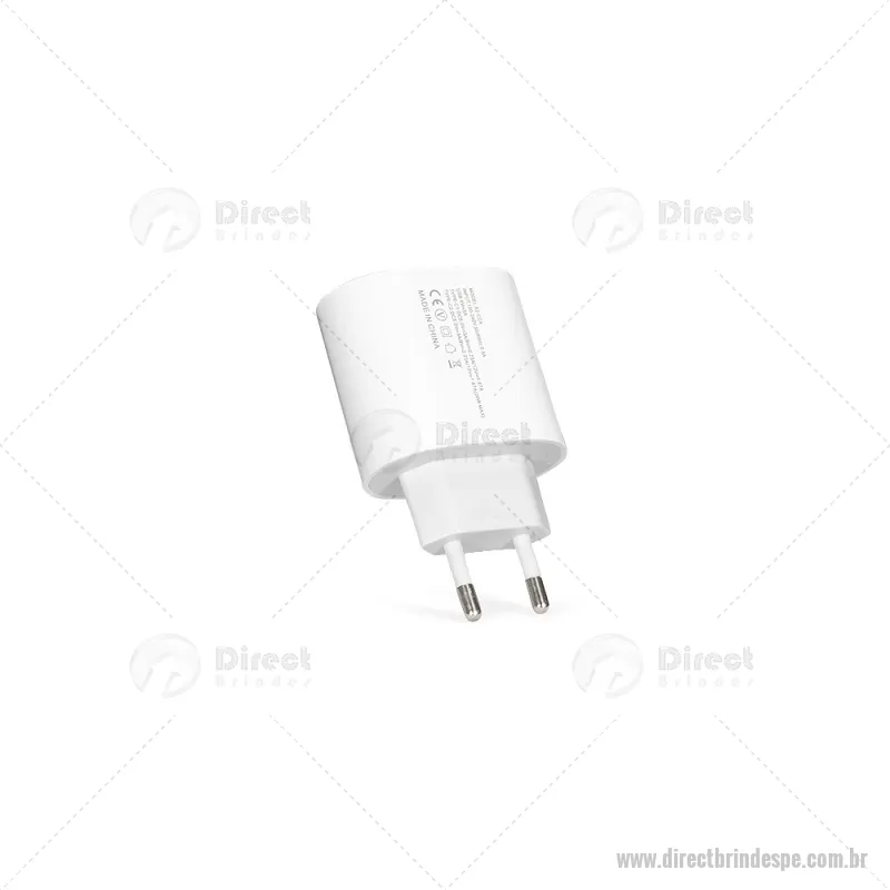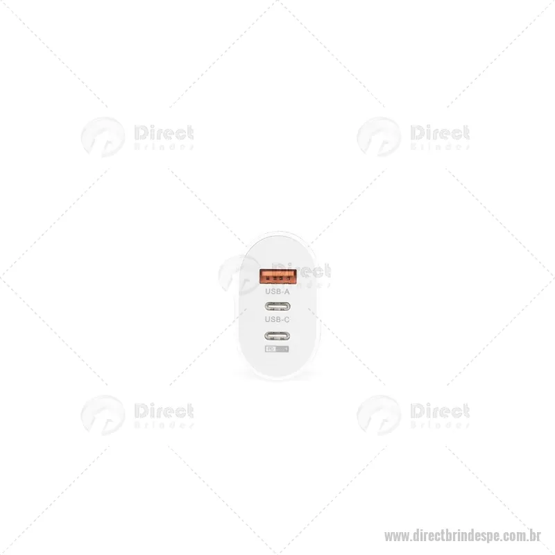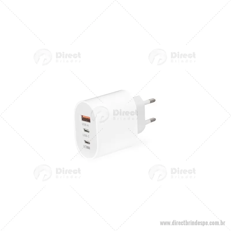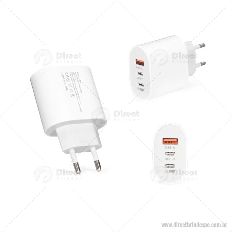 Carregador rápido em plástico leve e compacto, com três portas: uma USB-A e duas USB-C, incluindo uma opção de carregamento rápido de 20W. Ideal para recarregar diferentes dispositivos com praticidade. Cabo USB não incluído. - - DRTPETEC535