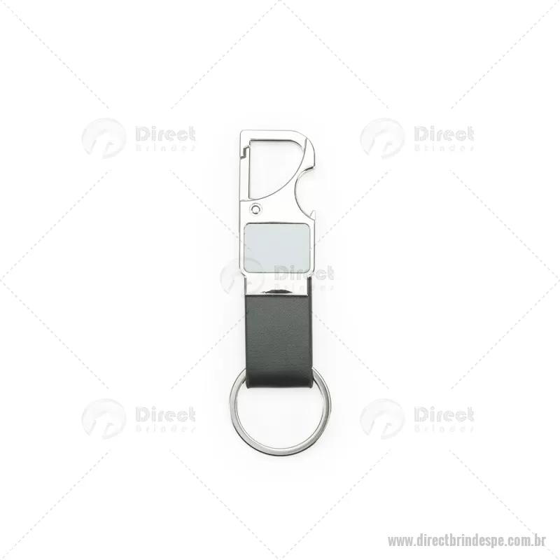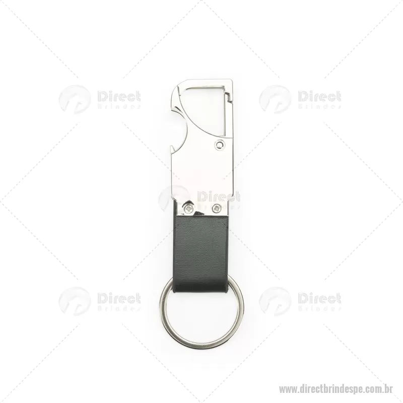 Chaveiro em metal com tira em couro sintético, equipado com mosquetão e função abridor de garrafas. Prático e funcional para o dia a dia. - - DRTPECHV215