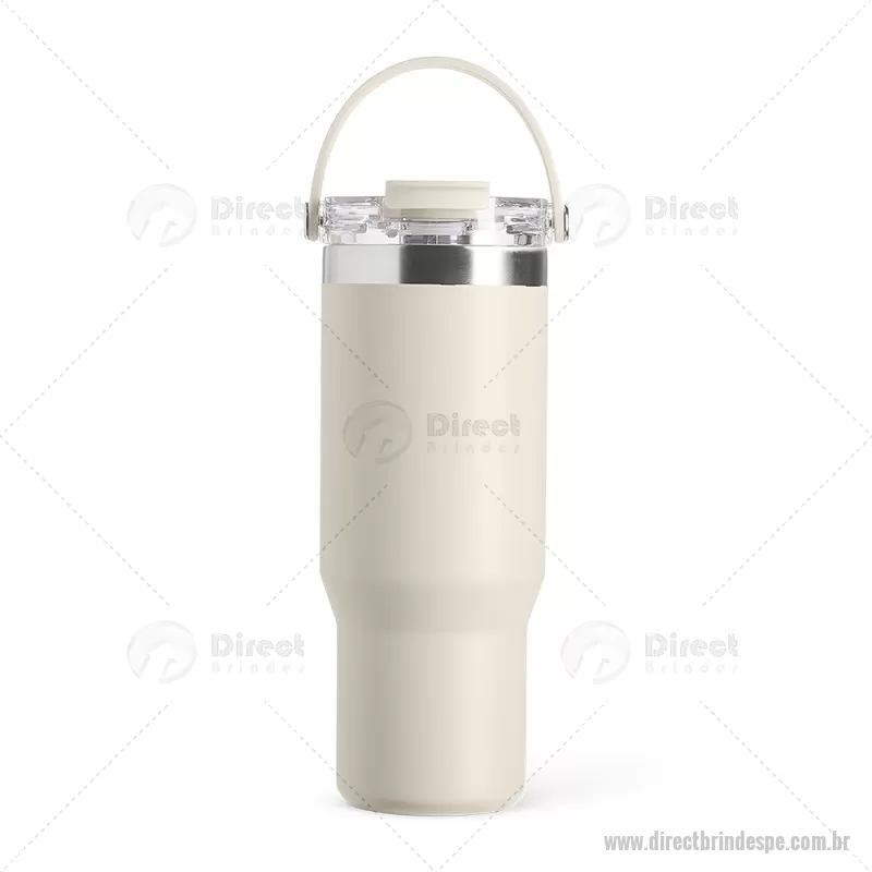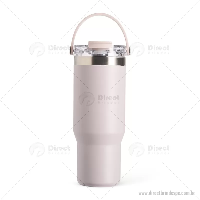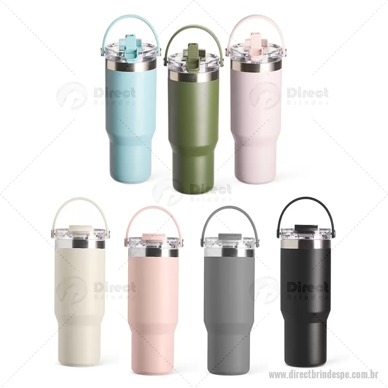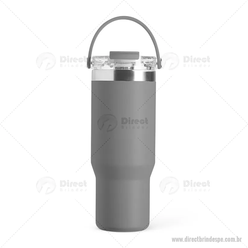 Copo térmico de 900 ml em aço inox com parede dupla, ideal para manter a temperatura de bebidas por mais tempo. Possui tampa plástica rosqueável com vedação a vácuo, proteção para o bocal, bico flip com canudo interno removível e alça para transporte. Conta com acabamento em pintura eletrostática, garantindo durabilidade e visual sofisticado. - - DRTPECPO146