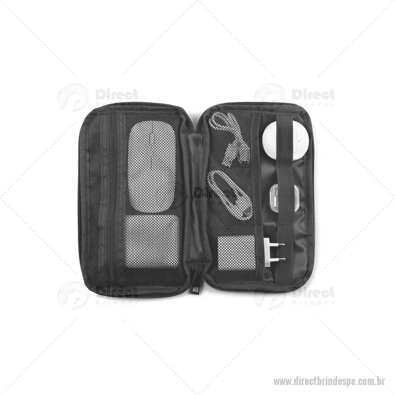 Bolsa organizadora em poliéster reciclado 600D de alta densidade com compartimento principal espaçoso para acessórios tecnológicos Bolsa organizadora para acessórios tecnológicos, recomendada para cabos, carregadores e pequenos dispositivos. Composta por poliéster reciclado 600D de alta densidade e forro em poliéster reciclado 210D. O compartimento principal contém vários bolsos para organizar individualmente todos os seus acessórios de maneira personalizada e funcional. Medidas: 220 x 130 x 25 mm Peso do Produto (g.): 72 - - DRTPEEMB047