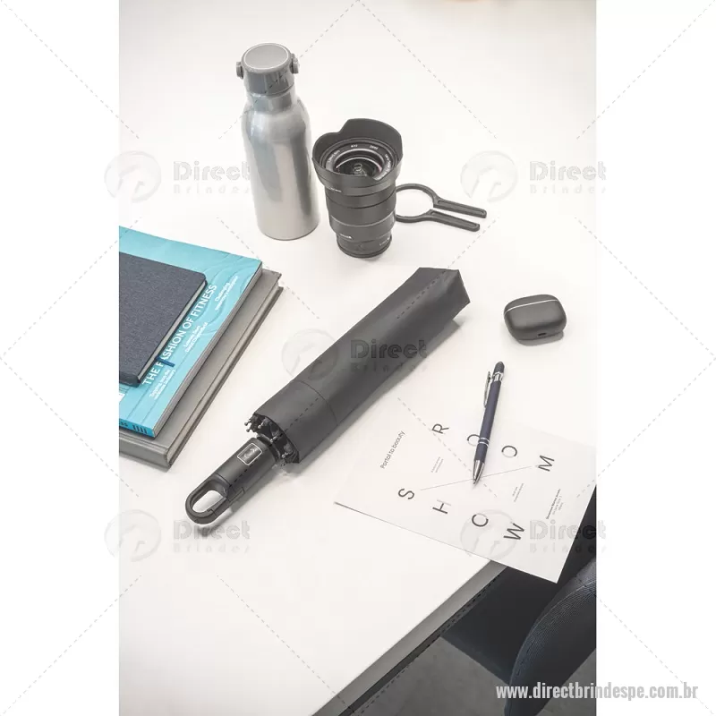 GUSTAVO. Guarda-chuva dobrável de 23'' em 100% poliéster reciclado pongee 190T (100% rPET) com abertura e fecho automático Guarda-chuva de 23'' em poliéster 100% reciclado pongee 190T, com varetas em fibra de vidro, haste metálica e pega em ABS 35% reciclado. O guarda-chuva, dobrável em 3 seções, tem abertura e fecho automático e é à prova de vento. Fornecido em bolsa. Medidas: ø1050 x 330 mm | Sacola: ø50 x 250 mm Peso do Produto (g.): 380 - - DRTPEGCH052