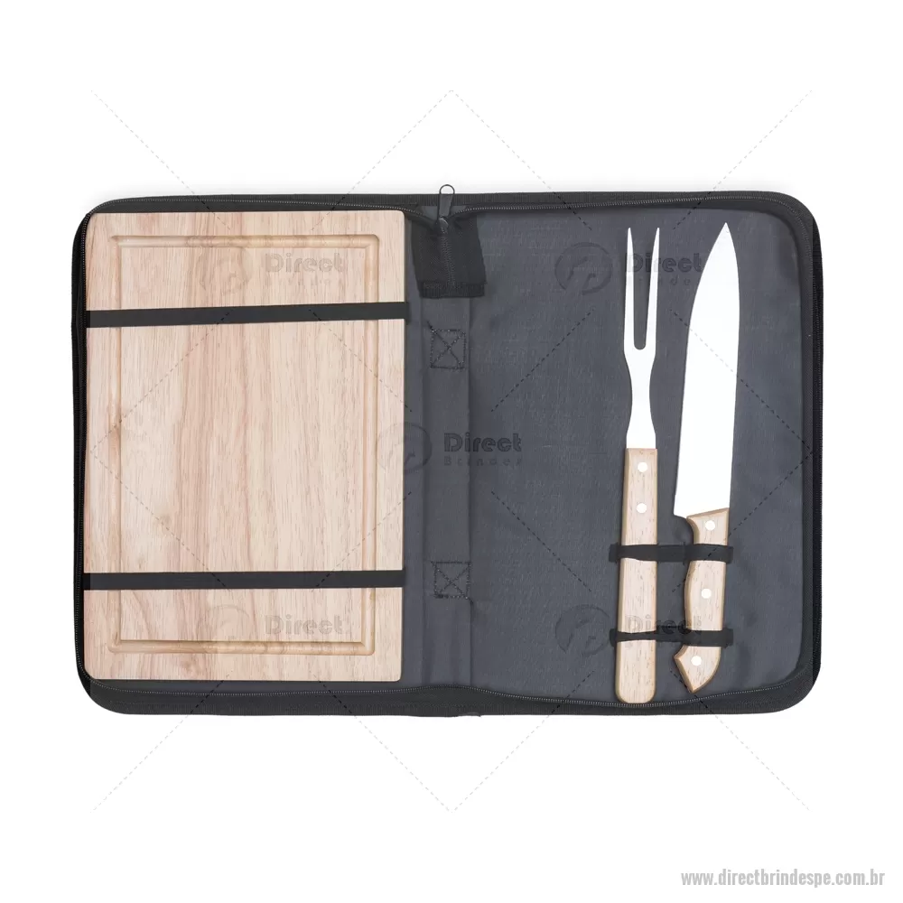 Kit churrasco 2 peças com tábua de madeira em estojo de nylon com alça. Possui tábua de madeira, garfo e faca. Acompanha proteções plásticas e parte interna com elástico para fixar as peças. - - DRTPEKCH044