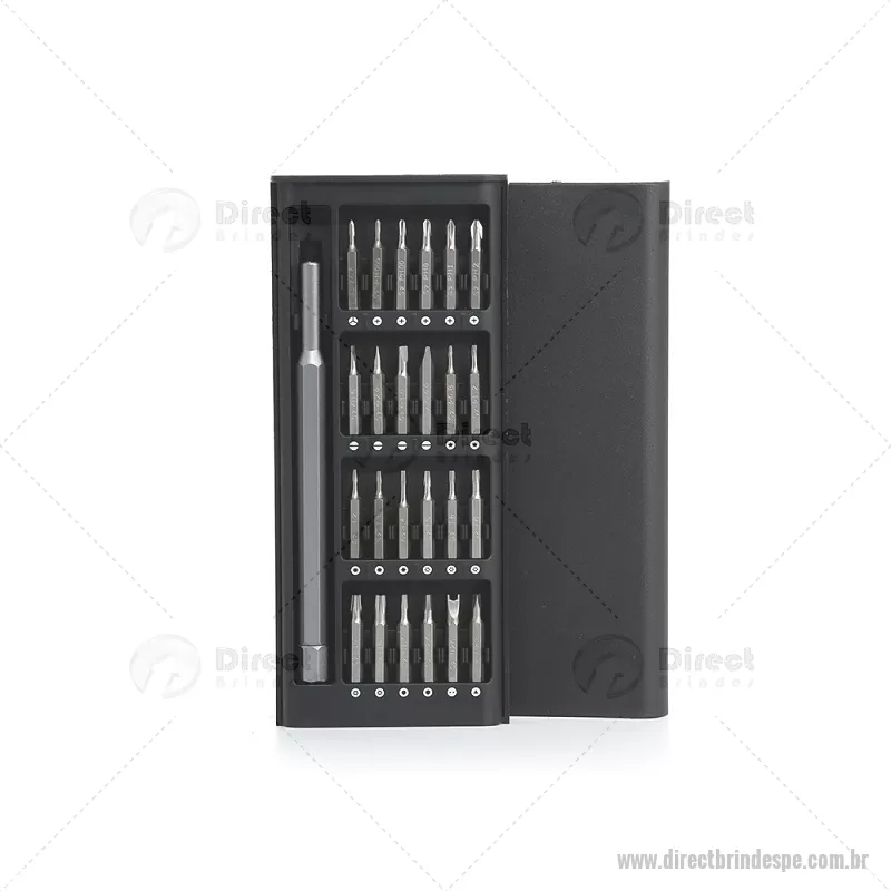 Kit ferramenta com 25 peças em estojo plástico com tampa de encaixe. Contém: 1 chave extensora rotatória para conexão das ponteiras, 1 ponteira Tri-Wing, 5 ponteiras Phillips, 4 ponteiras fenda, 10 ponteiras Torx, 2 ponteira Allen, 1 ponteira spanner e 1 ponteira fenda triangular. - - DRTPEFER058