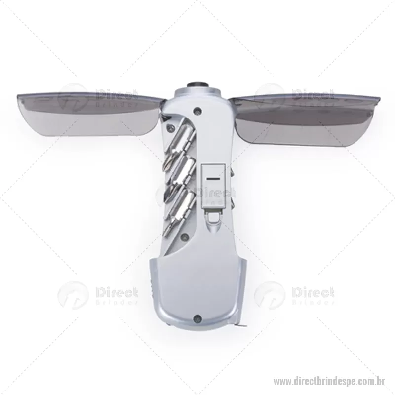 Kit ferramenta multifunções. Corpo prata com detalhes coloridos, abre pelas laterais e possui suporte superior para encaixar as pontas de cada chave. Possui 3 pontas de chaves Philips, 3 pontas de chave de fenda, nível, lanterna com botão para ligar/desligar e trena de 1 metro . Acompanha 3 baterias LR41. - - DRTPEFER024