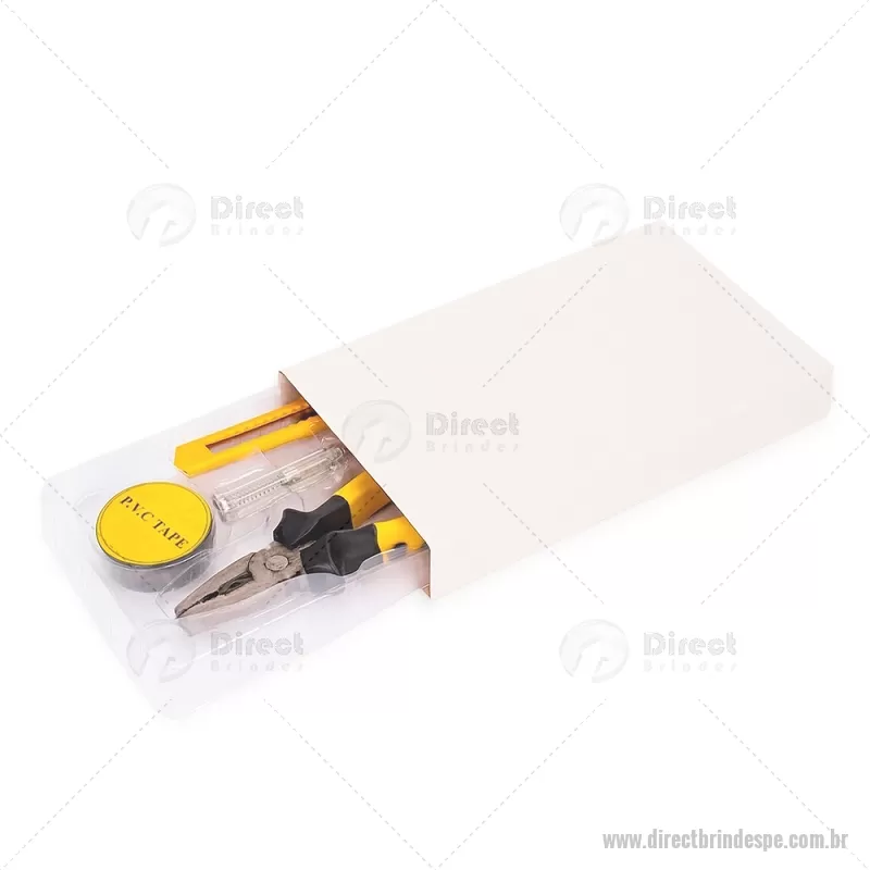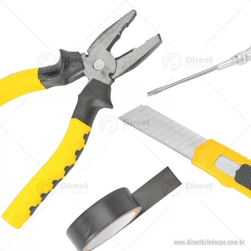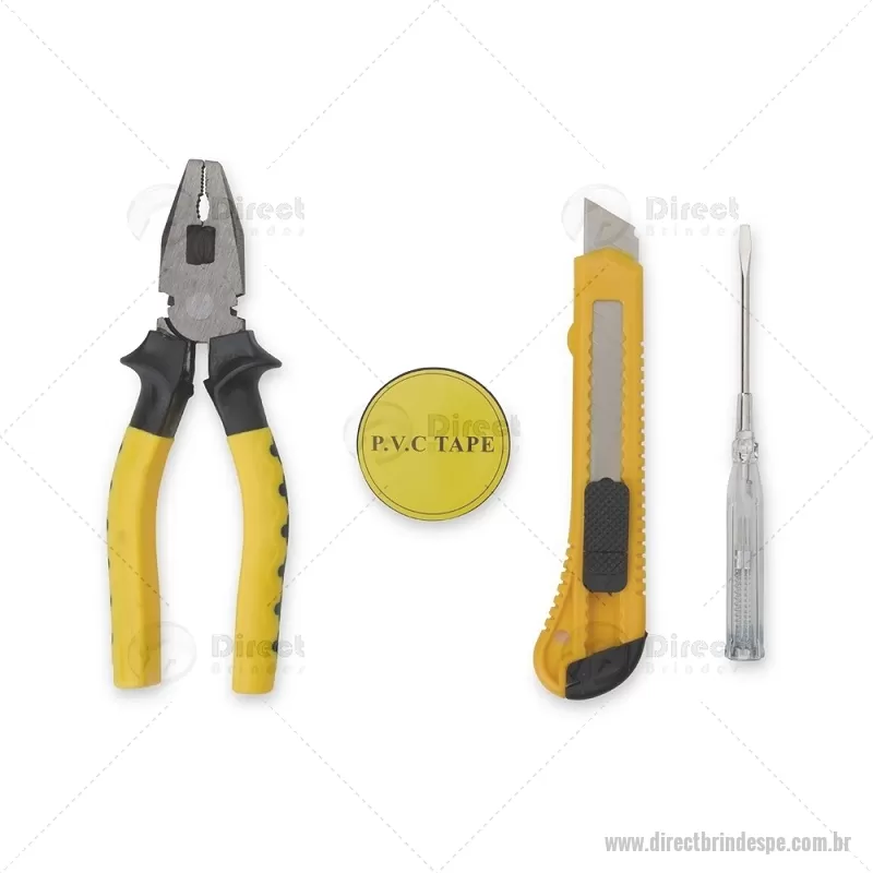 Kit de ferramentas compacto para uso diário, composto por chave de fenda teste, estilete, alicate e fita PVC. Todas as peças possuem acabamento em plástico resistente, oferecendo praticidade, conforto e durabilidade para pequenos reparos e imprevistos do dia a dia. - - DRTPEFER066