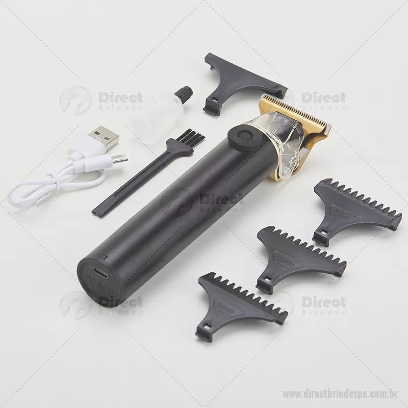 Máquina de cortar cabelo recarregável com lâminas em aço inoxidável, tampa plástica e corpo de alumínio. Acompanha 4 pentes plásticos (1mm, 2mm, 3mm e pente de proteção para as lâminas), escova de limpeza, óleo lubrificante e cabo USB-Tipo-C. - - DRTPEMASC007