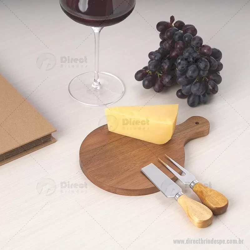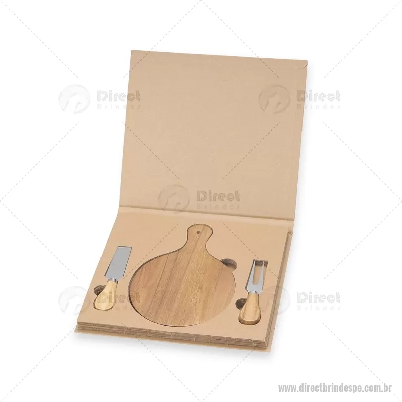 Kit queijo 3 peças em estojo kraft Contém: tábua de madeira redonda, faca reta, e garfo. Tábua com orifício para encaixe. Medidas produto : 23,9 cm x 27 cm x 2,3 cm Peso aproximado (g): 504 - - DRTPEKQJ037