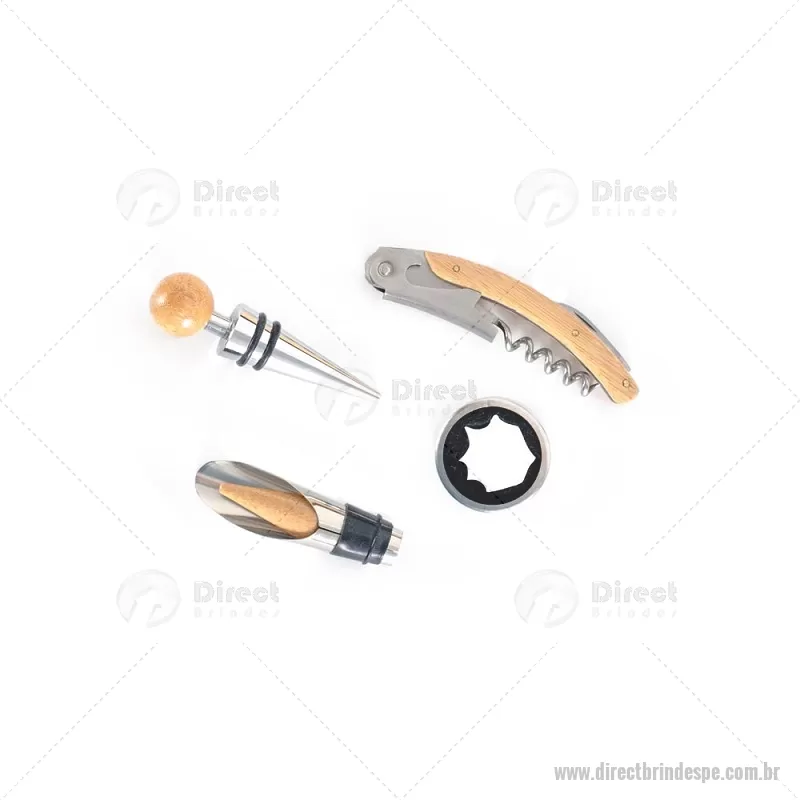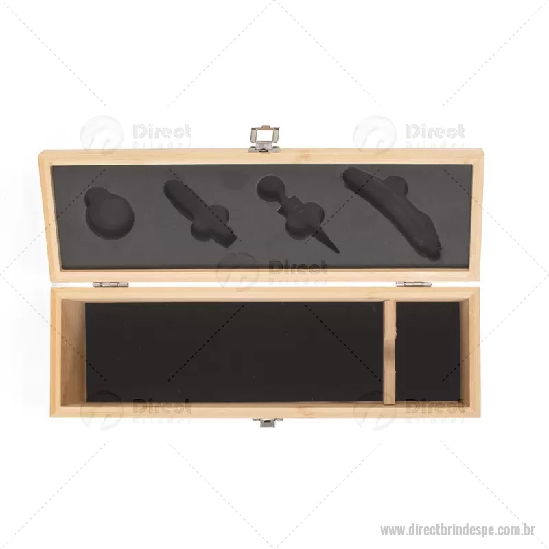 Kit Vinho em bambu com interior em EVA e fecho em inox, suporte para garrafa de vinho de 750 ml (padrão). Contém: saca-rolha de metal com detalhes em bambu e cortador de lacre, anel corta-gotas de metal, bico para servir de metal com tampa em bambu e tampa de metal com detalhe em bambu. Peso do Produto: 0,997kg Dimensão do Produto: 11x36x11cm *Não acompanha garrafa vinho, imagem meramente ilustrativa. - - DRTPEKVI051