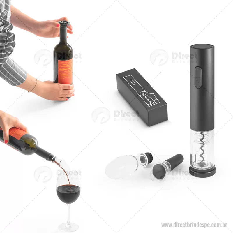 Conjunto de saca rolhas elétrico e acessórios em ABS e TPE. Incluso corta cápsulas, rolha de vácuo e salva-gotas. Com pilhas incluídas. Fornecido com caixa presente. Saca rolhas: 45 x 227 mm | Caixa: 241 x 90 x 54 mm - - DRTPEKVI041