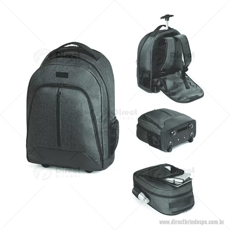 Ótima opção para Brinde corporativo personalizado com ótimo custo e qualidade. Mochila trolley com rodinhas para notebook. Feita em Nylon 600D de alta densidade e poliéster 600D impermeável. Para notebook até 15.6''. Bolso frontal com zíper e bolsos laterais com tela. Com protetor de rodas. Pega extensível em metal. Parte posterior e alças almofadadas. Placa metálica removível com imã, para fácil gravação. 340 x 430 x 170 mm. - - DRTPEMC123