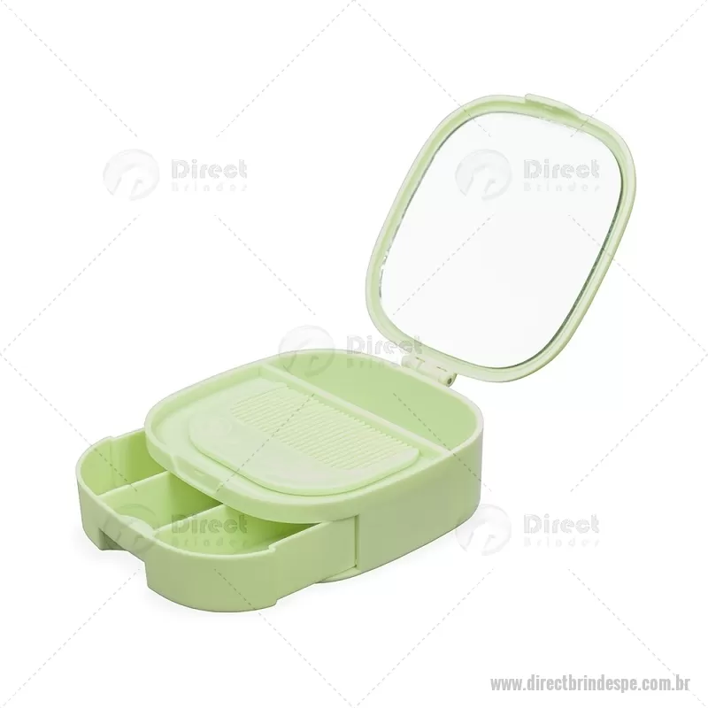 Porta-joias feito em plástico com espelho sem aumento na parte interna da tampa. Possui compartimentos internos de tamanhos variados e uma gaveta com três divisórias. Acompanha um pente compacto para cabelos. Altura : 3,5 cm x Largura : 9,9 cm x Comprimento : 9,9 cm Peso aproximado (g): 133 - - DRTPEFEM120