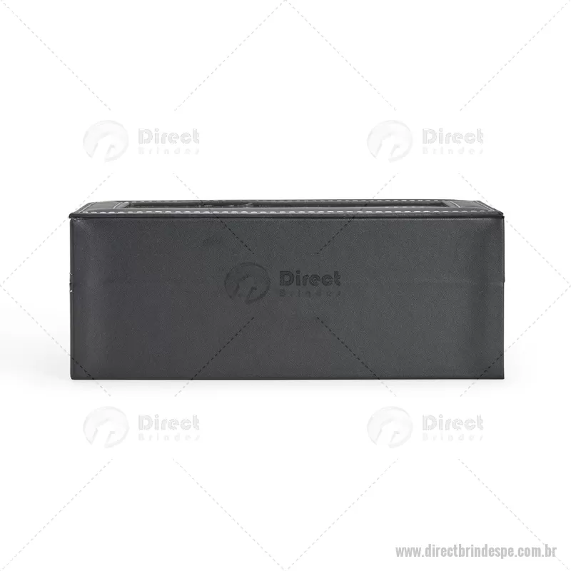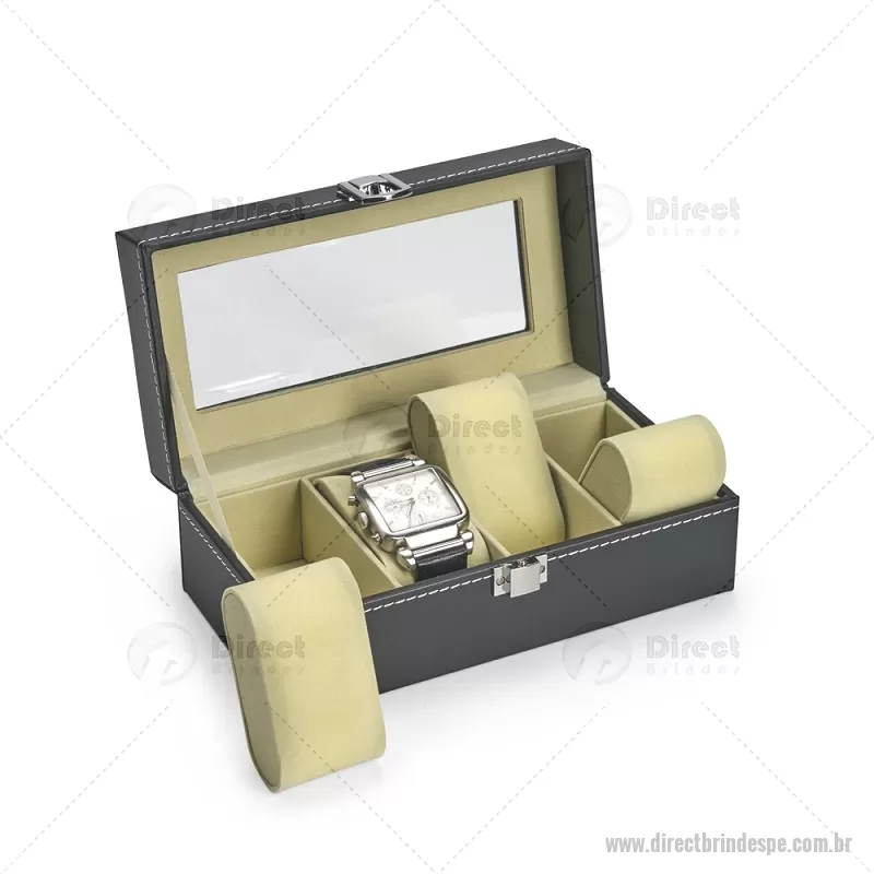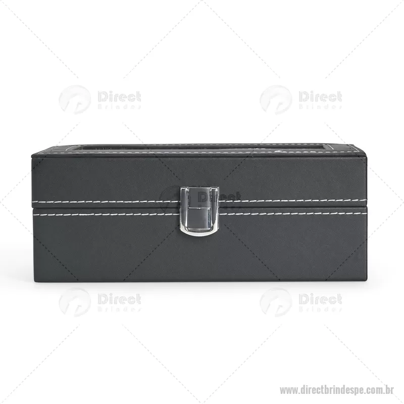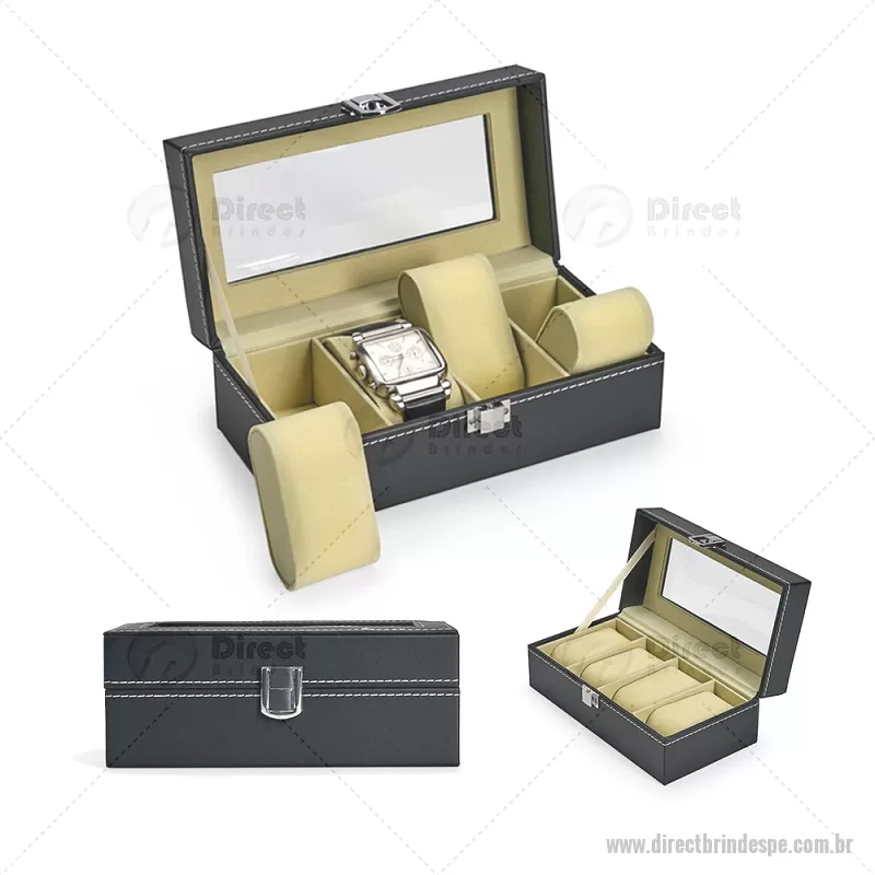 Porta-relógios com acabamento em couro sintético em PVC e interior forrado em veludo. Possui quatro compartimentos com almofadas de espuma removíveis, visor superior em vidro e trava de segurança, ideal para organizar e proteger relógios com elegância. - - DRTPEPREL003