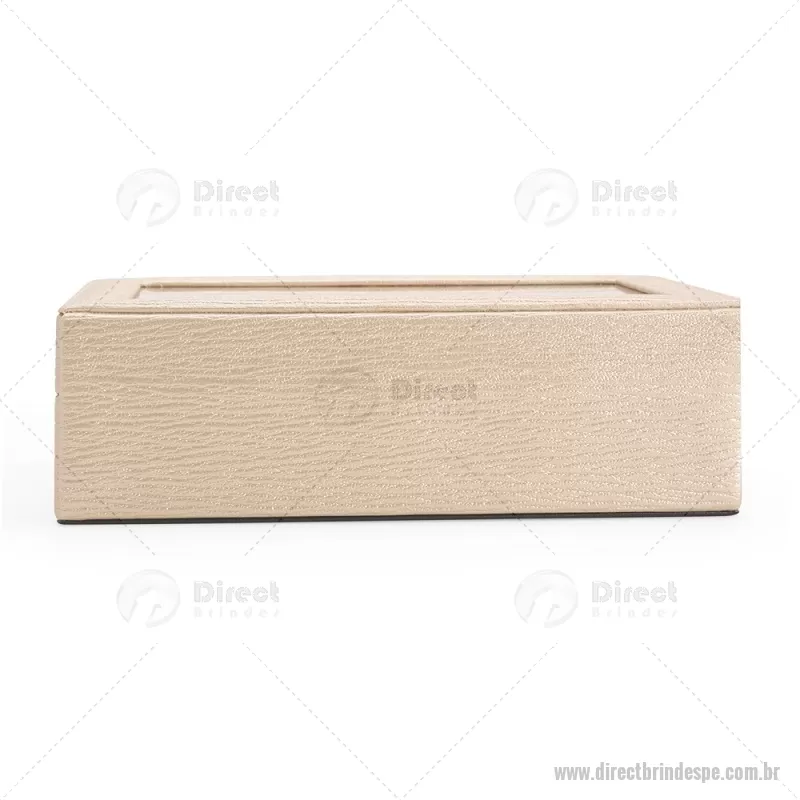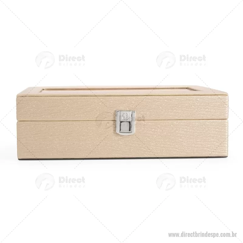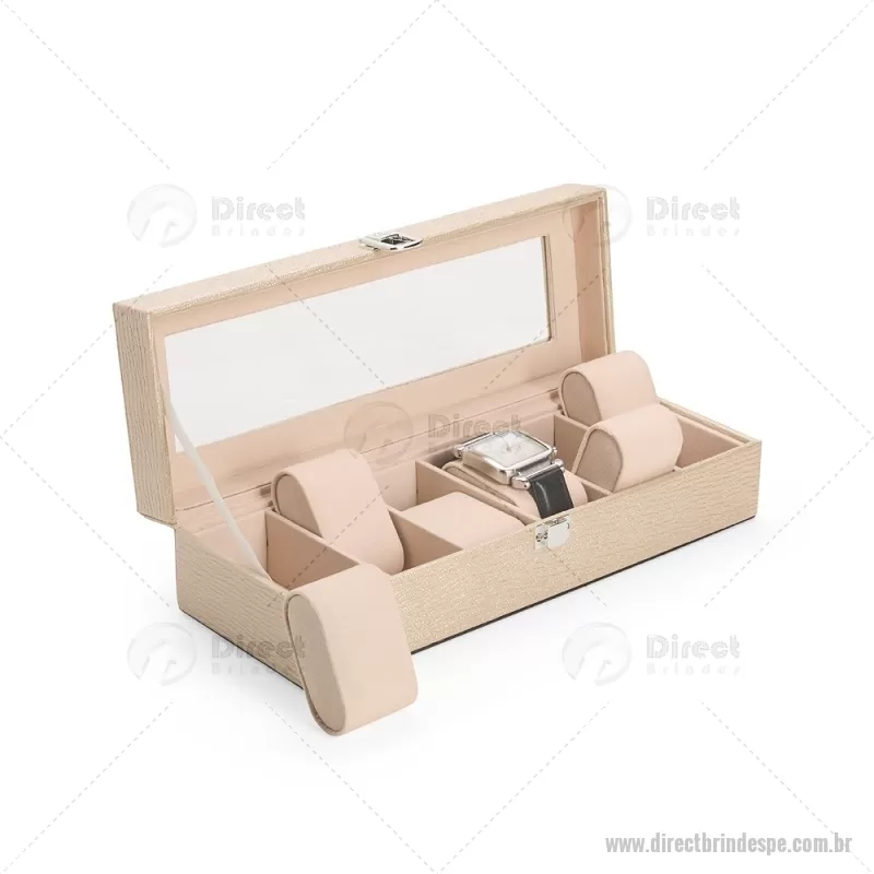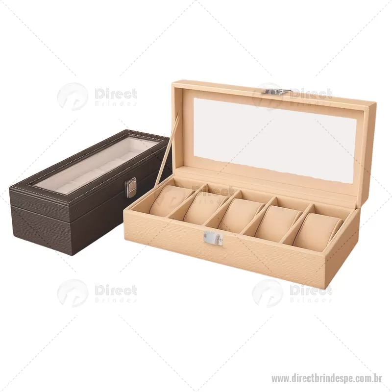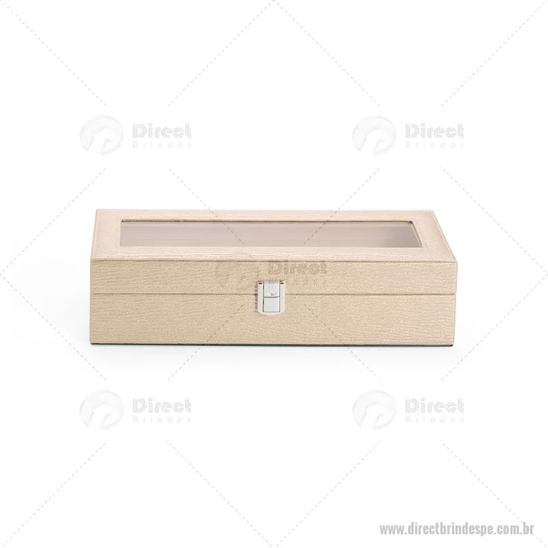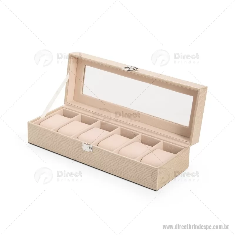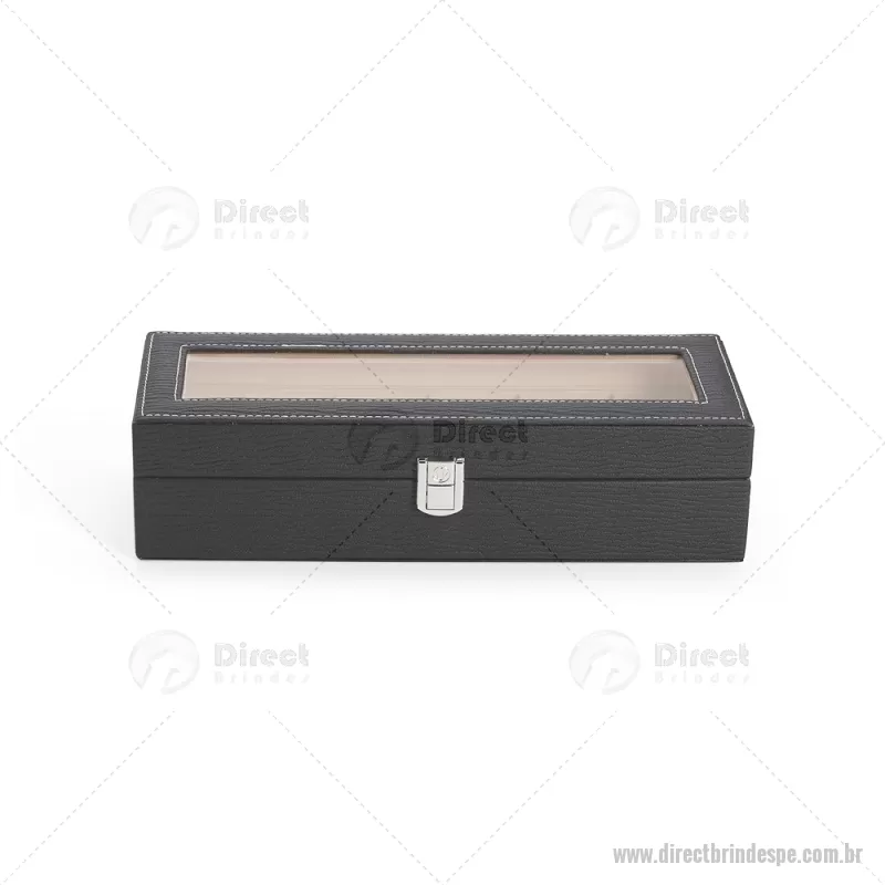 Porta-relógios com acabamento em couro sintético texturizado à base de PVC e interior revestido em tecido aveludado. Possui seis compartimentos com almofadas removíveis, visor em vidro transparente e trava de segurança, ideal para organizar e proteger relógios com elegância. - - DRTPEPREL004