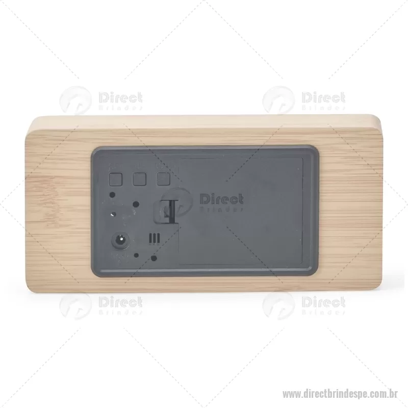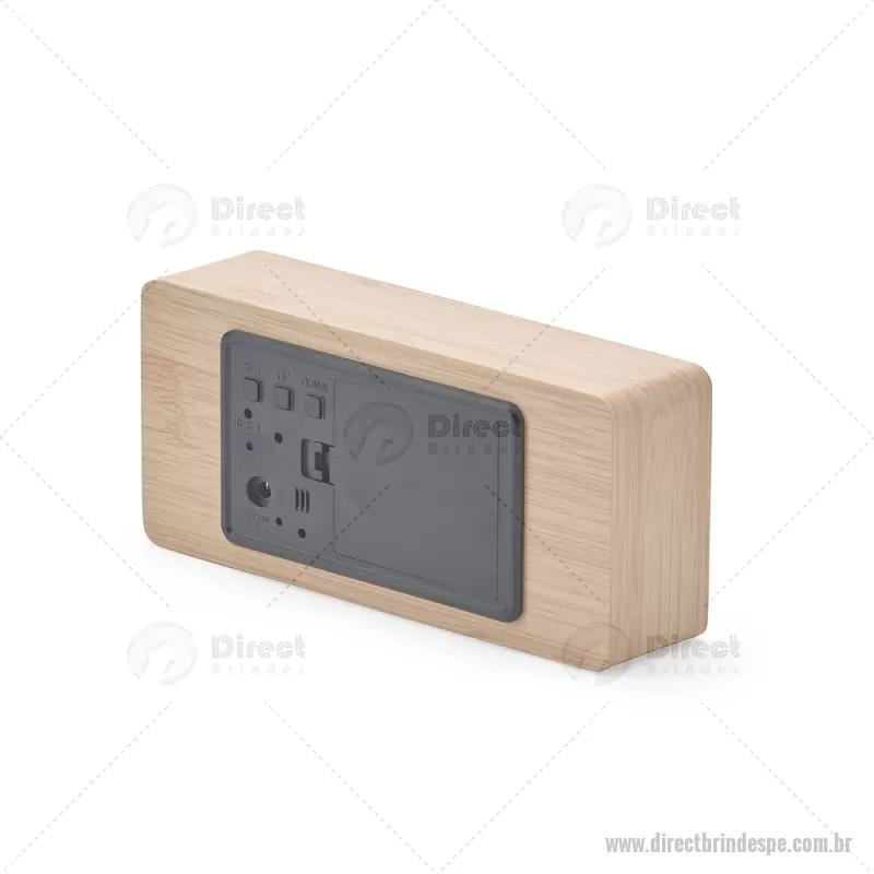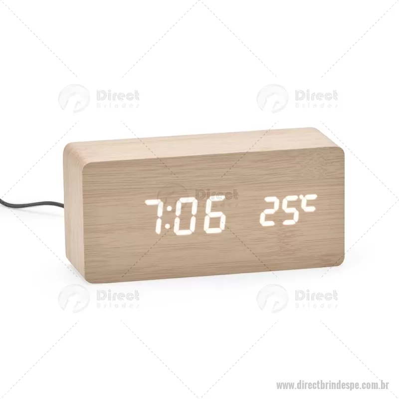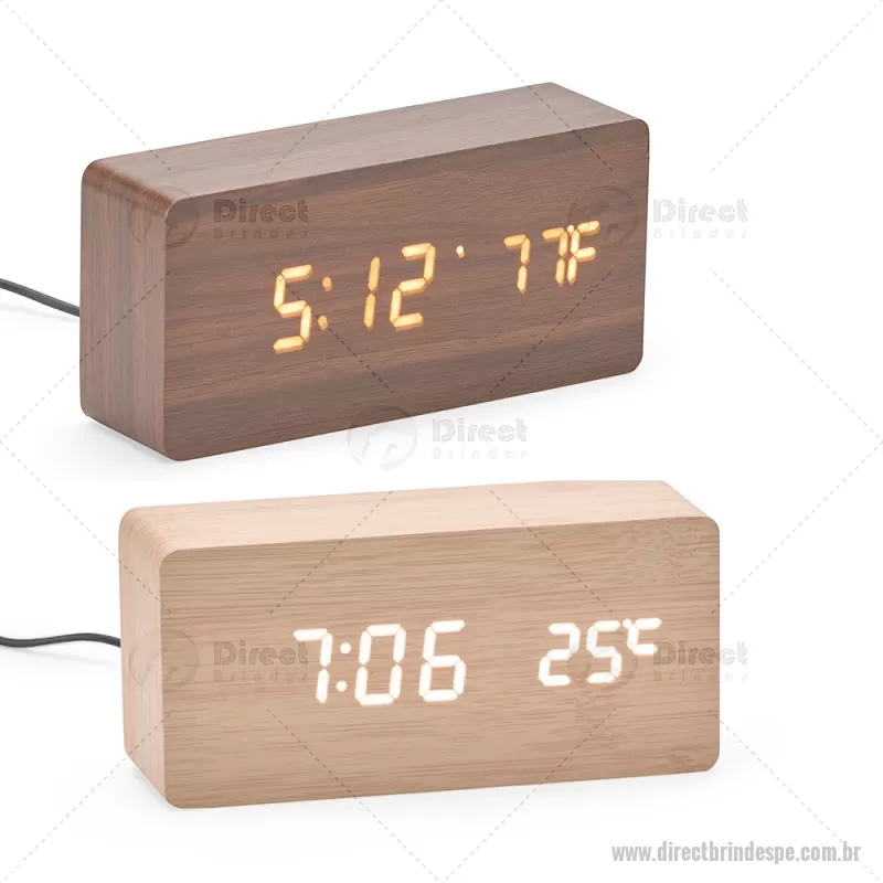 Relógio despertador em madeira com display LED, que combina design elegante e tecnologia moderna. Exibe horas, data e temperatura ambiente, além de permitir a programação de até três alarmes com diferentes configurações. Pode ser alimentado por 4 pilhas AAA (não inclusas) ou por cabo USB DC 5V, que acompanha o produto, oferecendo praticidade para o uso diário. - - DRTPEREL023